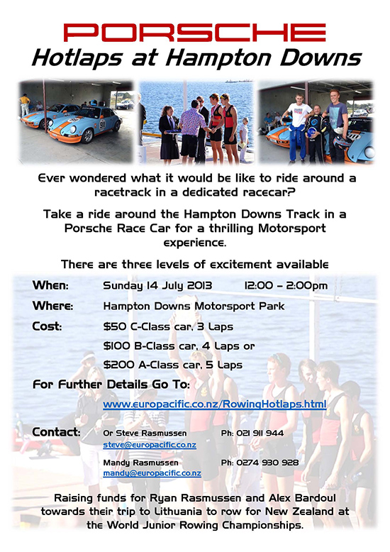 Come and experience what it is like to be in the passengers seat of a racing Porsche around one of New Zealand's newest race tracks. Not only are you benefiting from the thrill over travelling up to 200km/h but the money is going towards some of New Zealand's finest athletes, it's a win win senario! See the below flyer and race class details at the bottom of the page for more information.