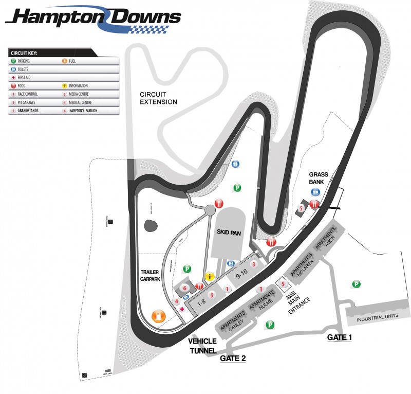 We will be based at Pit Garage 1 at Hampton Downs Motorsport Park. Enter through Gate 1 and turn left to head towards Gate 2. Head down through the vehicle tunnel under the track to the infield area. Follow the road round towards the main function centre (6 on the plan), then head for Garage 1 at the right-hand end of the pit garages. Park between the garage block and the Hampton's Pavilion (No. 6). (See map below)